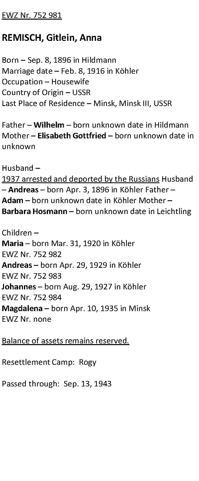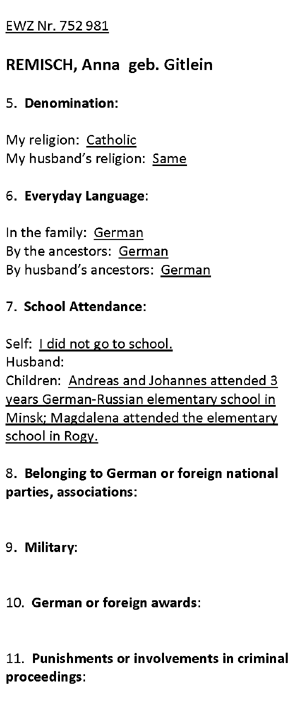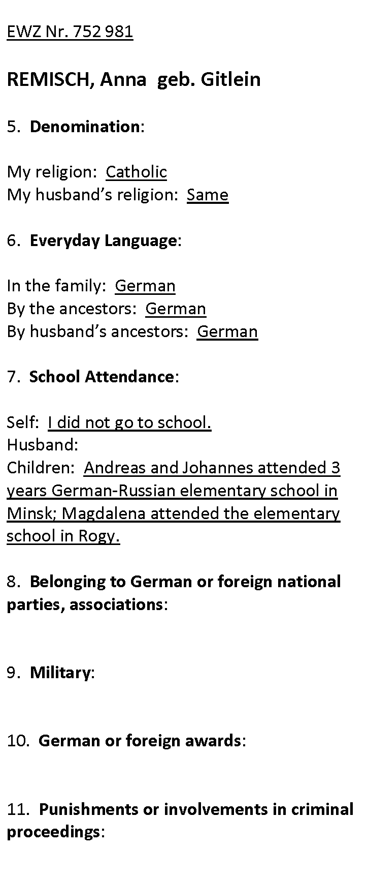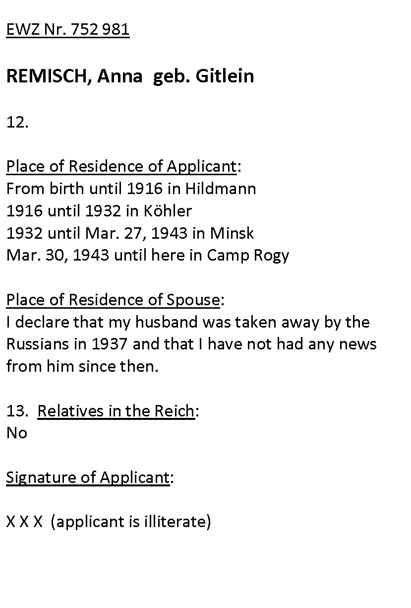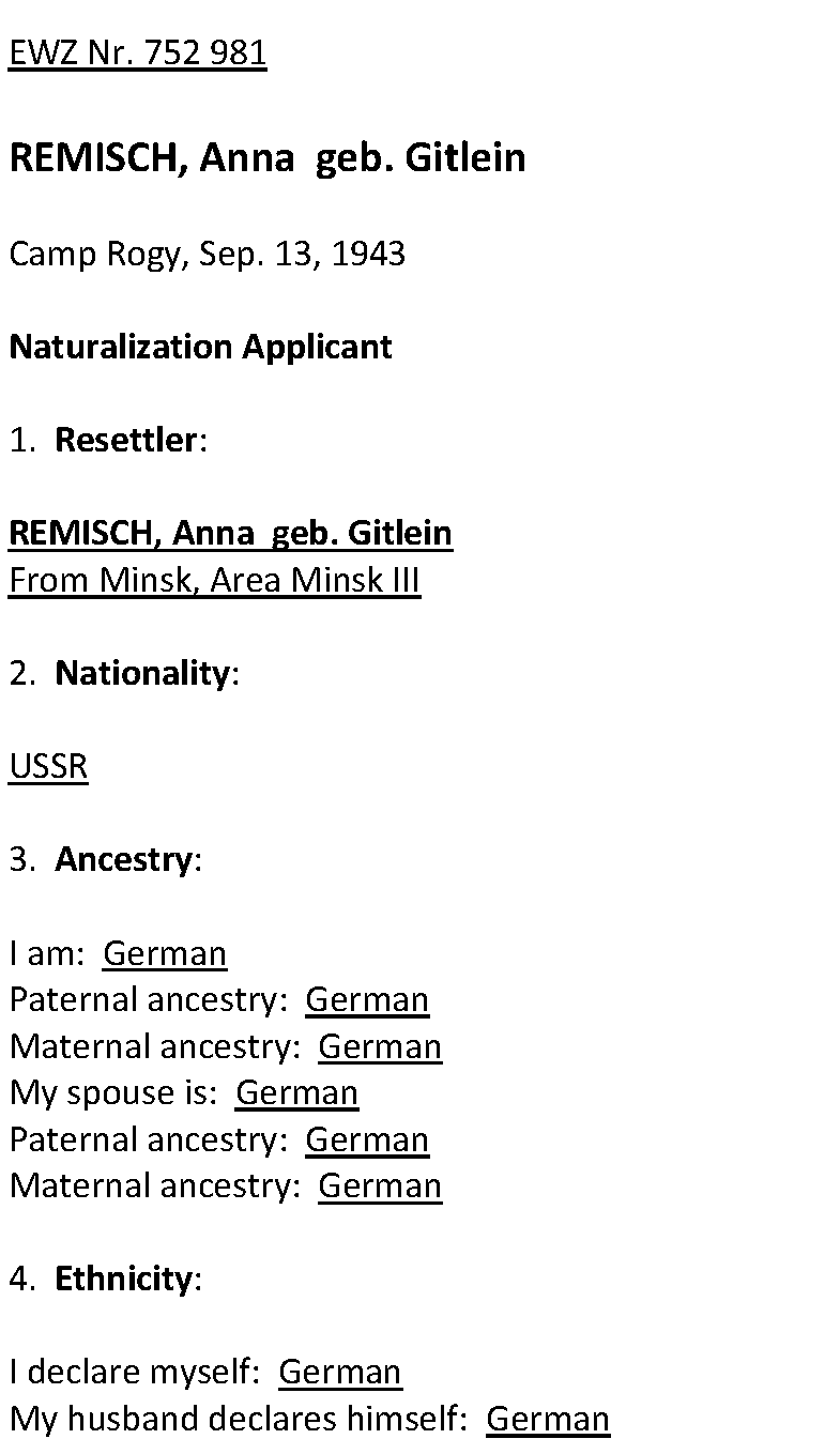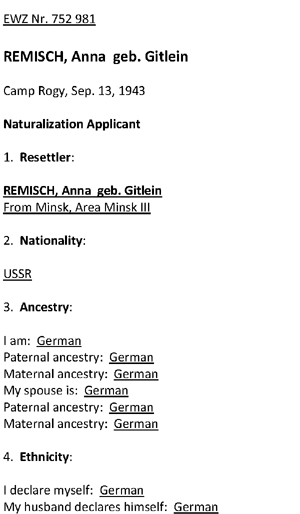 of the political situation at this time. Type of information available in an EWZ50 document: information on applicant including - name, birth date and place, last place of residence, name of parents, name of children and birth dates, marital status, date and place of marriage, information on spouse and the information on spouses’ parents, date transported and latest address or camp. The form usually includes pedigree chart where up to four generations can be recounted to prove that the applicant was 100 percent German. There is also a section for the applicant’s story and the dates of their residences in Russia to the present. Some EWZ records have pictures of the applicant. These forms (when completed and accepted) were processed so applicants could go to Germany. Below is a portion of a translated EWZ50 record of Anna Remisch – born Gitlein – from Hildmann, Saratov, Volga, Russia. (For privacy concerns – I use a record from my own ancestor.) This will illustrate to “visual learners” and “non-Germans” what can be learned from investigating these records (in conjunction with records, censuses and other methods of research). Please note that the Hildmann EWZ Records are in German but follow a prescribed “format” which may make them accessible to researchers without a firm knowledge of the German language. EWZ (Einwandererzentralstelle) Index for Miscellaneous Films - Hildmann Published by the Odessa Digital Library - http://www.odessa3.org * COPYRIGHT STATEMENT: This document may be freely used for personal, non-profit purposes or linked by other WWW sites. It may also be shared with others, provided the header with copyright notice is included. However, it may not be republished in any form without permission of the copyright owner. Instructions to the Index for Hildmann EWZ50 information: http://www.odess3.org *please note that this is not a secure site At the Homepage - Click on "COLLECTIONS" Click on "FULL TEXT SEARCH" On the ODESSA 3 SEARCH page – Input "Hildmann" beside Query String: Beside "Data Category": – Click on box and scroll to bottom of list Click on "War Records" Click on the box "Submit Query" Ways to obtain EWZ50 Records for Hildmann* Germans from Russia Heritage Society (GRHS) will send individual EWZ50 records - $5.00 per page – payable by PayPal They may not have all records but this is a method if you want a few records quickly. The Office Manager usually sends within the day upon receiving payment. Quote the name and information from the Hildmann Index above. Contact – rachel@grhs.org Rachel Schmidt, Office Manager National Archives and Records Administration – College Park, Maryland will permit a request for up to three files. It takes up to three weeks to receive. They send the copies over the web service “We Transfer.” Contact - archives2reference@nara.gov for further information. For multiple files or records - the National Archives microfilm publications are available for $125.00 per roll/disk. See form below. Berlin Document Center - The “war records” are now in Germany but the entire collection was microfilmed and is stored in the U.S. National Archives for access to researchers. For more information - https://en.wikipedia.org/wiki/Berlin_Document_Center ![]() http://www.archives.gov/files/research/ordaer/microfilm-order-form.pdf |