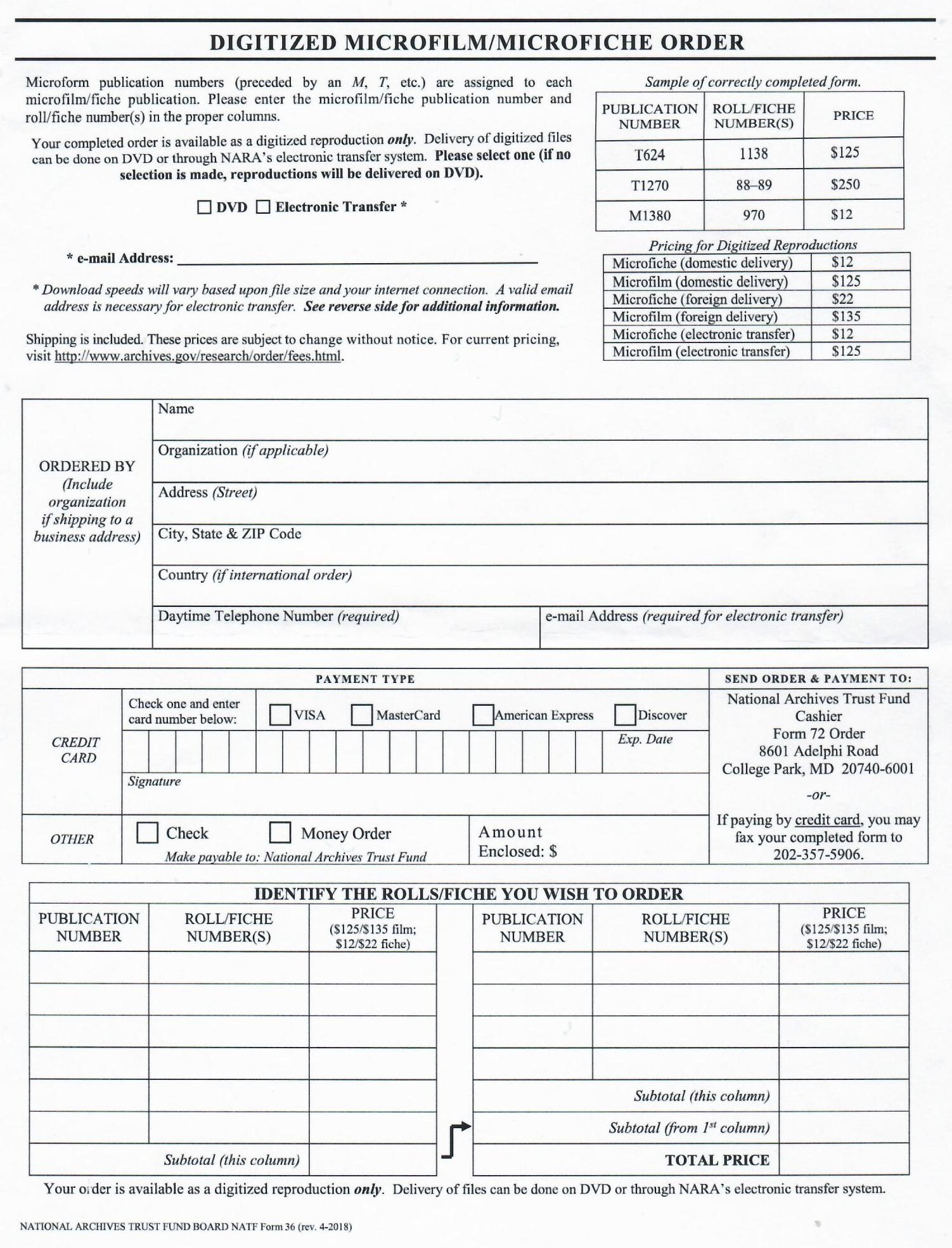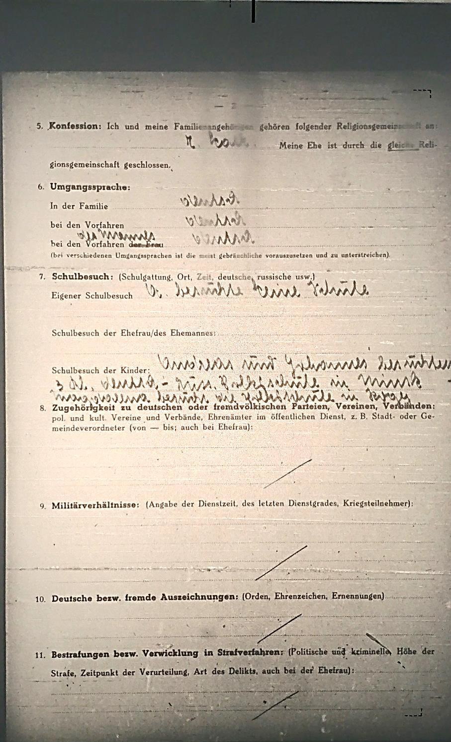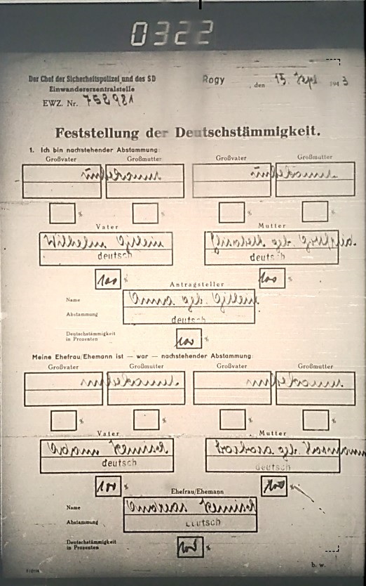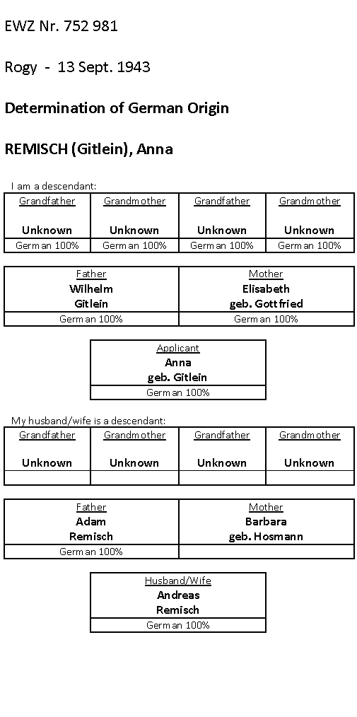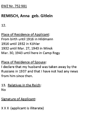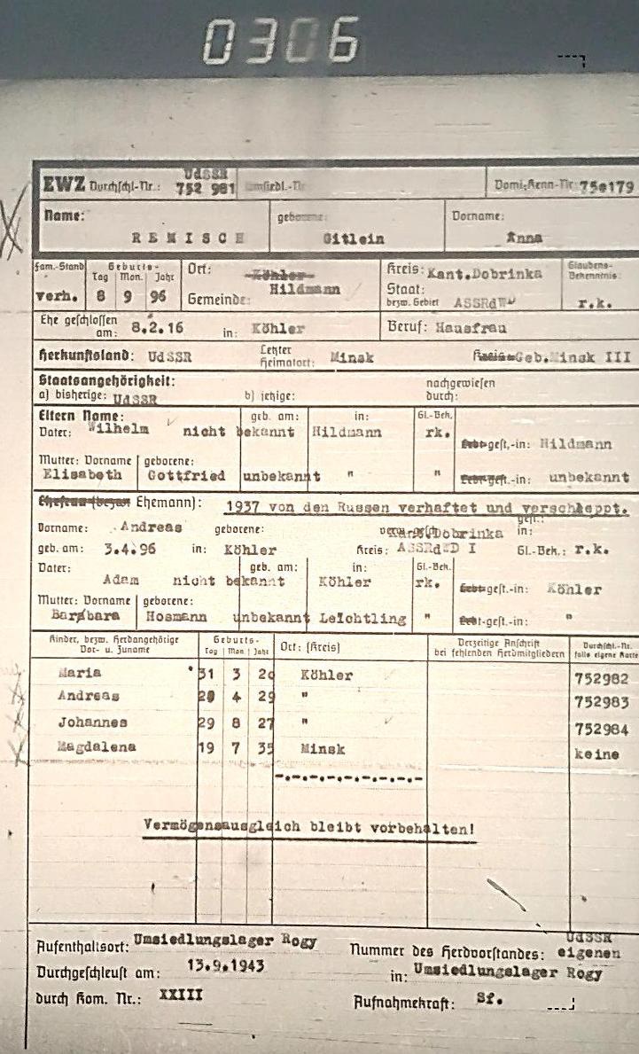 of the political situation at this time. Type of information available in an EWZ50 document: information on applicant including - name, birth date and place, last place of residence, name of parents, name of children and birth dates, marital status, date and place of marriage, information on spouse and the information on spouses’ parents, date transported and latest address or camp. The form usually includes pedigree chart where up to four generations can be recounted to prove that the applicant was 100 percent German. There is also a section for the applicant’s story and the dates of their residences in Russia to the present. Some EWZ records have pictures of the applicant. These forms (when completed and accepted) were processed so applicants could go to Germany. Below is a portion of a translated EWZ50 record of Anna Remisch – born Gitlein – from Hildmann, Saratov, Volga, Russia. (For privacy concerns – I use a record from my own ancestor.) This will illustrate to “visual learners” and “non-Germans” what can be learned from investigating these records (in conjunction with records, censuses and other methods of research). Please note that the Hildmann EWZ Records are in German but follow a prescribed “format” which may make them accessible to researchers without a firm knowledge of the German language. EWZ (Einwandererzentralstelle) Index for Miscellaneous Films - Hildmann Published by the Odessa Digital Library - http://www.odessa3.org * COPYRIGHT STATEMENT: This document may be freely used for personal, non-profit purposes or linked by other WWW sites. It may also be shared with others, provided the header with copyright notice is included. However, it may not be republished in any form without permission of the copyright owner. Instructions to the Index for Hildmann EWZ50 information: http://www.odess3.org *please note that this is not a secure site At the Homepage - Click on "COLLECTIONS" Click on "FULL TEXT SEARCH" On the ODESSA 3 SEARCH page – Input "Hildmann" beside Query String: Beside "Data Category": – Click on box and scroll to bottom of list Click on "War Records" Click on the box "Submit Query" Ways to obtain EWZ50 Records for Hildmann* Germans from Russia Heritage Society (GRHS) will send individual EWZ50 records - $5.00 per page – payable by PayPal They may not have all records but this is a method if you want a few records quickly. The Office Manager usually sends within the day upon receiving payment. Quote the name and information from the Hildmann Index above. Contact – rachel@grhs.org Rachel Schmidt, Office Manager National Archives and Records Administration – College Park, Maryland will permit a request for up to three files. It takes up to three weeks to receive. They send the copies over the web service “We Transfer.” Contact - archives2reference@nara.gov for further information. For multiple files or records - the National Archives microfilm publications are available for $125.00 per roll/disk. See form below. Berlin Document Center - The “war records” are now in Germany but the entire collection was microfilmed and is stored in the U.S. National Archives for access to researchers. For more information - https://en.wikipedia.org/wiki/Berlin_Document_Center ![]() http://www.archives.gov/files/research/ordaer/microfilm-order-form.pdf |